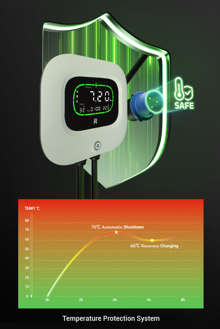 Atunci când este instalat cu ștecherul inclus, încărcarea se oprește automat la 70°C și se reia la 60°C, oferind liniște sufletească în timpul sesiunilor prelungite de încărcare.